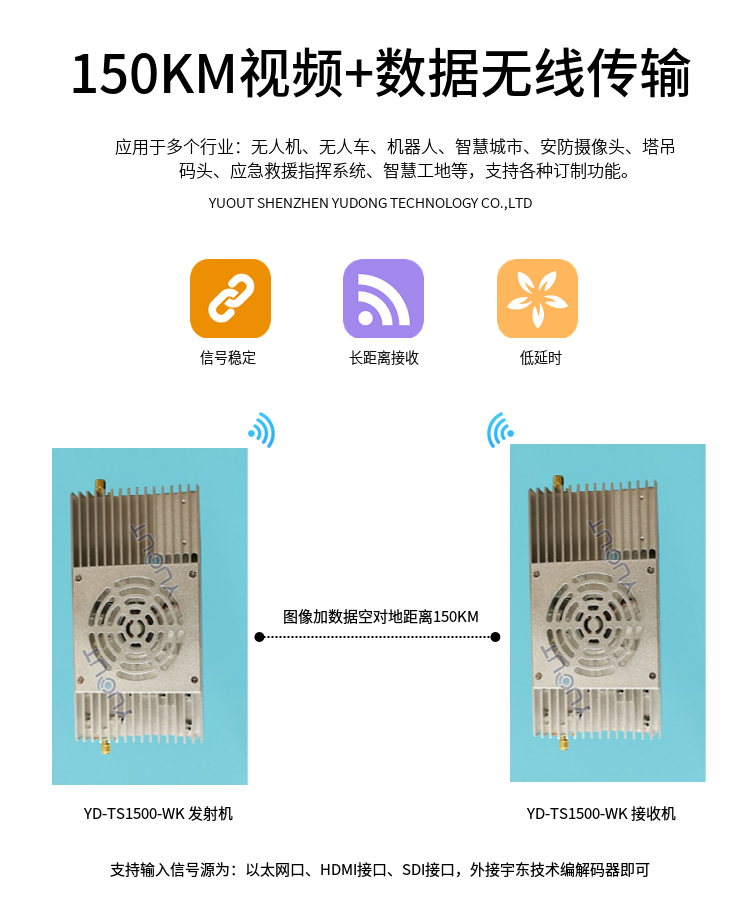 YD-TS1500-WK  是應用于無人機行業的圖數控一體化超遠距離無線傳輸設備(最遠可達 15至20 公里),具有體積小、功耗低、通信距離遠等特點,支持高清視頻、飛控數據、云臺控制數據、遙控器控制數據等同時傳輸。