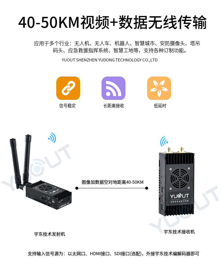 YD-TS0050-WK 是應(yīng)用于無人機行業(yè)的圖數(shù)控一體化超遠距離無線傳輸設(shè)備(最遠可達 40至50 公里),具有體積小、功耗低、通信距離遠等特點,支持高清視頻、飛控數(shù)據(jù)、云臺控制數(shù)據(jù)、遙控器控制數(shù)據(jù)等同時傳輸。