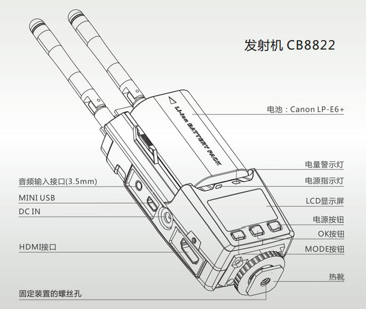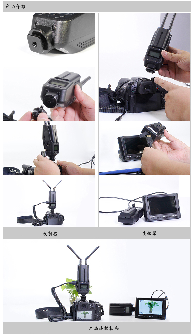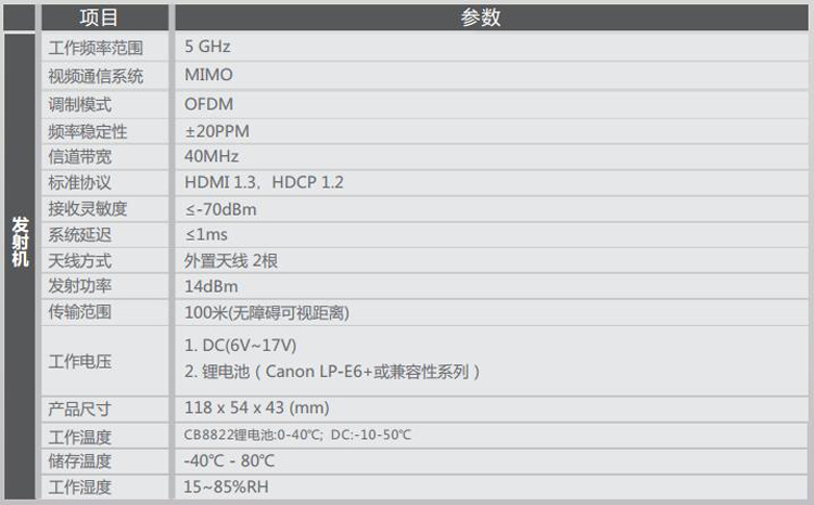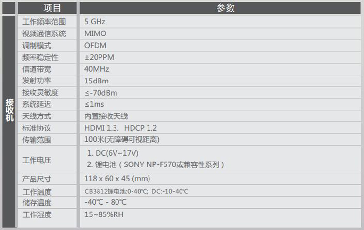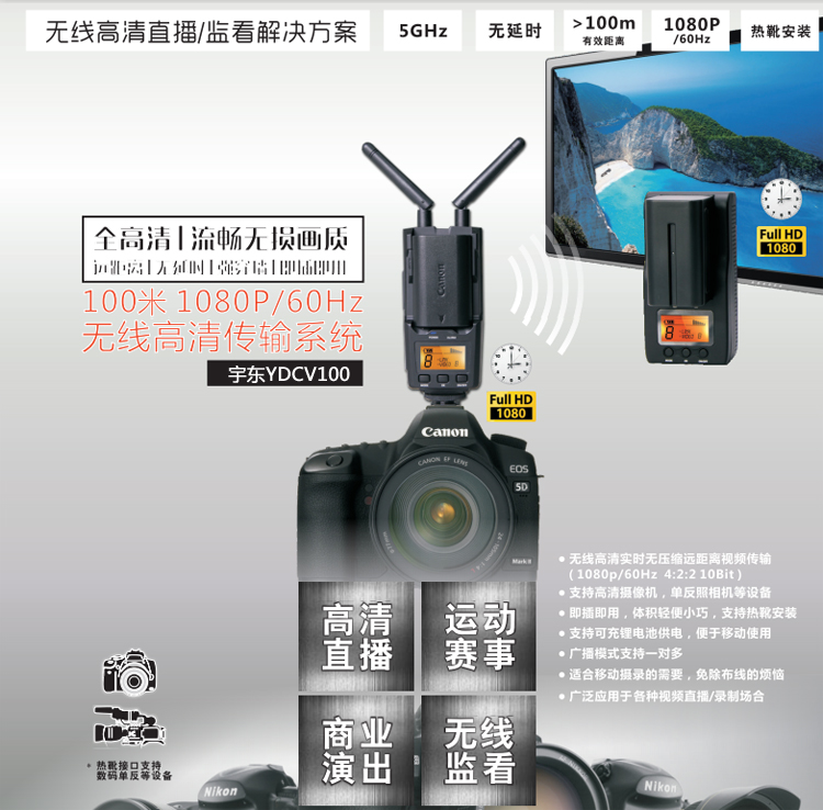 100米HDMI無(wú)線高清視頻傳輸器 HDMI 100米無(wú)線傳輸器 拍電影專(zhuān)用 適用攝像機(jī)、照相機(jī)等帶有HDMI輸出的便攜高清視頻設(shè)備; -支持DC供電(電源適配器12V、寬電壓范圍的應(yīng)急電源(6V~17V)或安裝鋰電池 (SONY NP-F570/F750/Canon LP-E6+及兼容系列電池)供電,內(nèi)部有防止電源范姐的保護(hù)設(shè)計(jì); -正面結(jié)構(gòu)為鋰電池卡座,用來(lái)安裝SONY。 隨著高清影視設(shè)備越來(lái)越廣泛的應(yīng)用,其布線過(guò)程中也出現(xiàn)了多方面的問(wèn)題,如線材成本較高,使用壽命短,如果現(xiàn)場(chǎng)保護(hù)不夠,路過(guò)人群的踩踏可能影響線材表現(xiàn),甚至引發(fā)直播事故。本方案為影視直播場(chǎng)景提供了更加便捷安全的解決方案,其遠(yuǎn)距離傳輸多頻點(diǎn)支持配合大容量鋰電池系統(tǒng),即插即用設(shè)置,能充分的滿足各種室內(nèi)外拍攝需求,尤其是免布線的特點(diǎn),將帶給您更安全,更便利的專(zhuān)業(yè)體驗(yàn)。